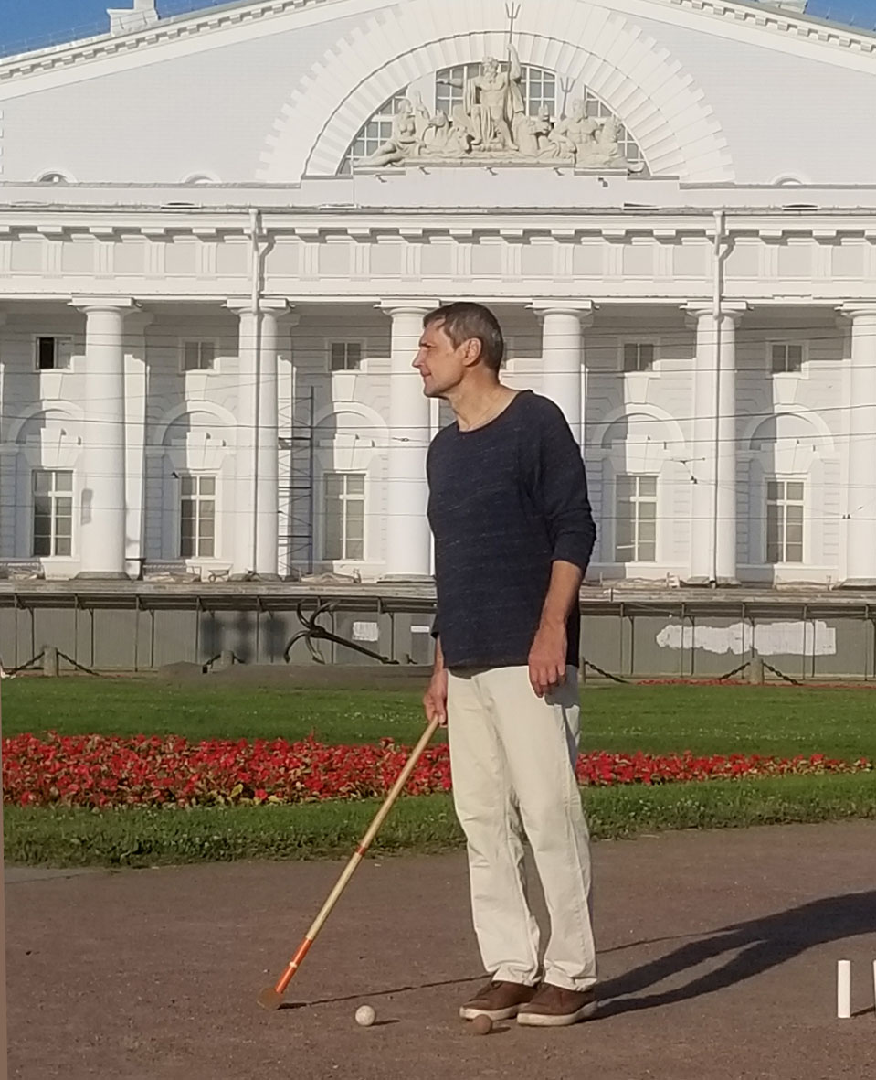 Петербургский крокет - оригинальная самобытная спортивная игра, вид спорта, созданный в России. Основное отличие от широко известных разновидностей крокета, русского, классического и гольф-крокета, в том, что в классическом крокете игроки выполняют параллельные задачи (провести свои шары сквозь воротики), а в петербургском крокете задачи соперников противоположны: один игрок проводит свой шар сквозь воротики, а другой старается ему в этом помешать (выбить его шар), если ему это удается, то они меняются ролями, уже другой игрок начинает проводить свой шар сквозь воротики, а его соперник старается ему помешать. Всего в игре задействовано три шара диаметром 5 см: красный, оранжевый и белый. Средняя продолжительность игры 5-10 минут. Характер игры в петербургском крокете принципиально отличается от классических разновидностей, что дает основания считать петербургский крокет не разновидностью крокета, а отдельной оригинальной спортивной игрой. Игра придумана мною в девяностые годы ХХ-го века. С 2007-го года в поселке Комарово под Петербургом ежегодно проводятся спортивные турниры, с 2024-го года турниры проводятся в Москве и Ленинградской области. Леонид Кипарисов, 2025
